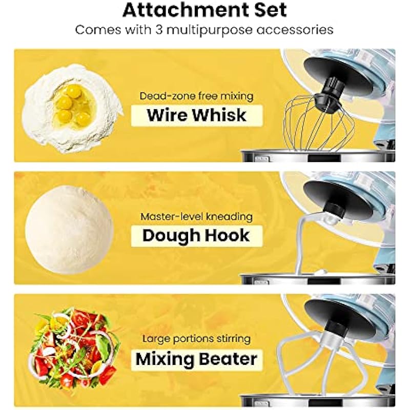 - SAFE &STURDY BOWL – Made of food-grade stainless steel, it ensures the health of the whole family; Large 6QT capacity meets daily kitchen requirements; The bowl can be fixed to the base, which makes it stay steady during mixing work; Considerable design of a handle will facilitate your operation; With suction cups on the bottom of the base, the kitchen mixer won’t move all over the counter