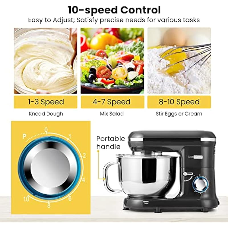 - POWERFUL MOTOR – High-performance 660W motor finishes kneading and mixing quickly and thoroughly than human hands; Handy 10-speed control with a pulse function can satisfy precise needs for various mixing tasks; Heavy-duty metal gears lead to stable and quiet working; Features 2 heat vents outlets, the VIVOHOME mixer has a rapid heat dissipation for long service life