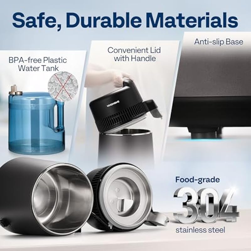 - DURABLE MATERIAL SMART DESIGN: All the parts in contact with liquid are made of food-grade 304 stainless steel or BPA-free plastic; The highest-quality interior components offer durability and prevent liquid leakage; The handle on the lid makes it easy to open; The non-slip design prevents falling; With the extra waterproof ON/OFF smart switch on the shell of the electric water distiller, you can leave it for a while during distillation, which is safer and more convenient