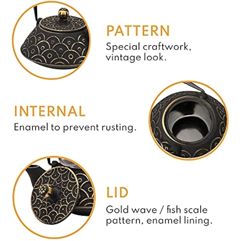 - Exquisite Design – Black cast iron kettle with gold traditional Japanese wave / fish scale pattern design makes VUDECO Japanese tea kettle steady and elegant. Classic vintage black and gold design enhances the authentic ancient Japanese culture and adds artistic feeling while brewing your tea for daily ritual or display as an ornament.