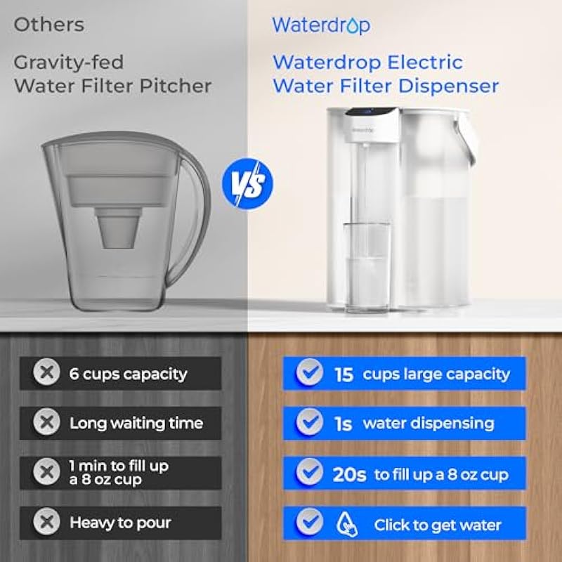 - Fashionable And Large Capacity, Good Gift for Day: This water filter dispenser adopts a fashion and streamlined design. It can slot conveniently into the refrigerator to save space. The large capacity with 40-cup (21 cups in the body) also meets the needs of many people effectively. Drink more water everyday with Waterdrop. 3-pack replacement filters are available for purchase! (search model: WD-PF-01A).