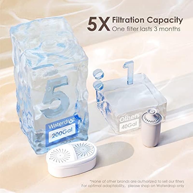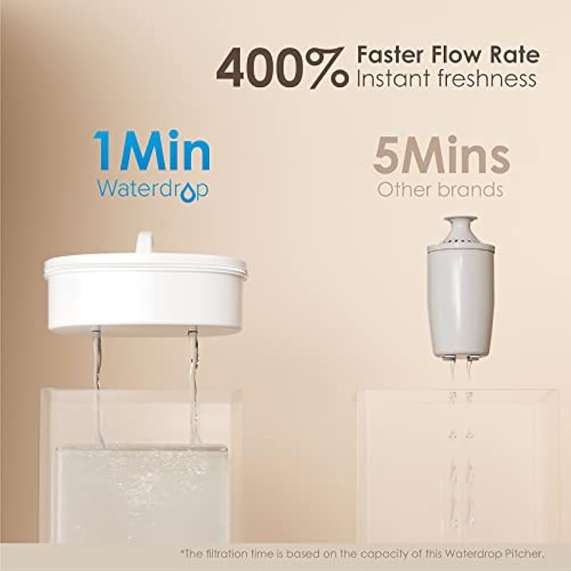 - 5x lifespan: The water filter pitcher has a filter lifespan of up to 200 gallons. With an extended lifespan, you can purify your drinking water for longer. The flow rate of the Waterdrop filter pitcher ensures filtration effect.