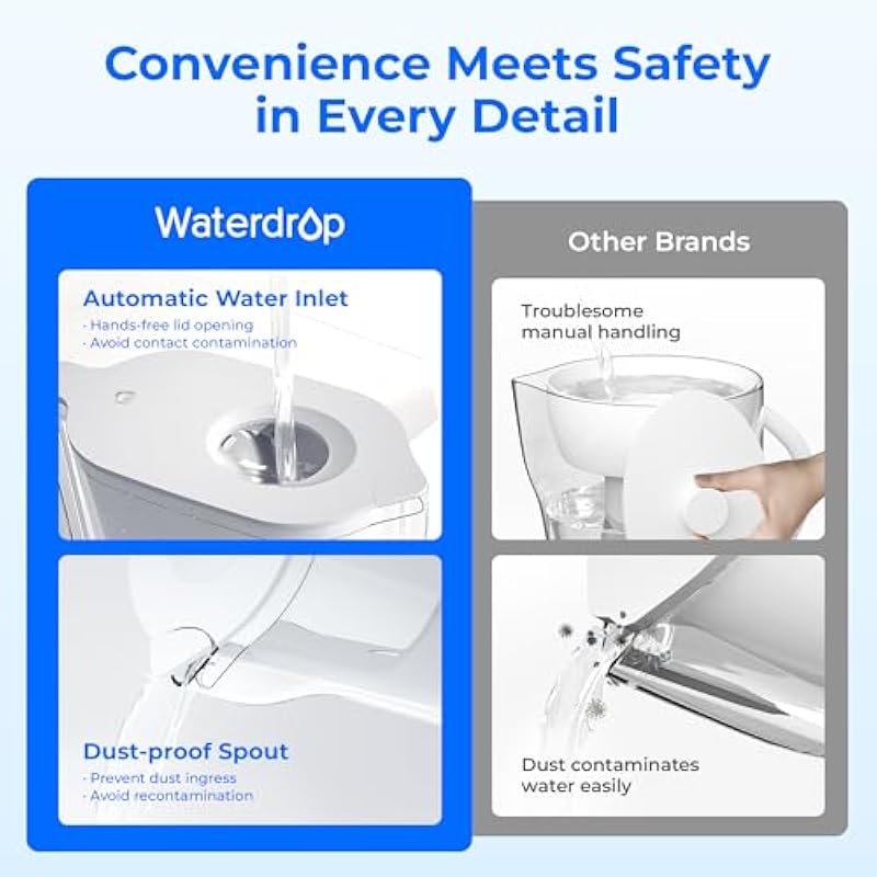 - [Dedicated filtration performance]: Using multi-stage water filter technology, this water filter pitcher can effectively reduce chlorine, PFOA/PFOS, odor, iron, and metal ions, tested by a third lab. The main purpose of the Waterdrop pitcher is not TDS reduction.