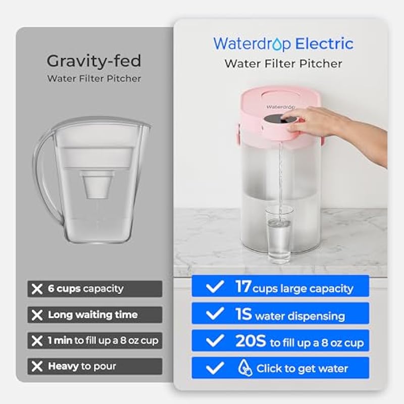 - [Fast Water Dispensing] This electric water filter pitcher dispenses water instantly, thanks to its advanced electric filtration. You no longer have to wait for your water to filter. Simply press a button and get clean water instantly, saving you time and adding convenience to your daily routine.