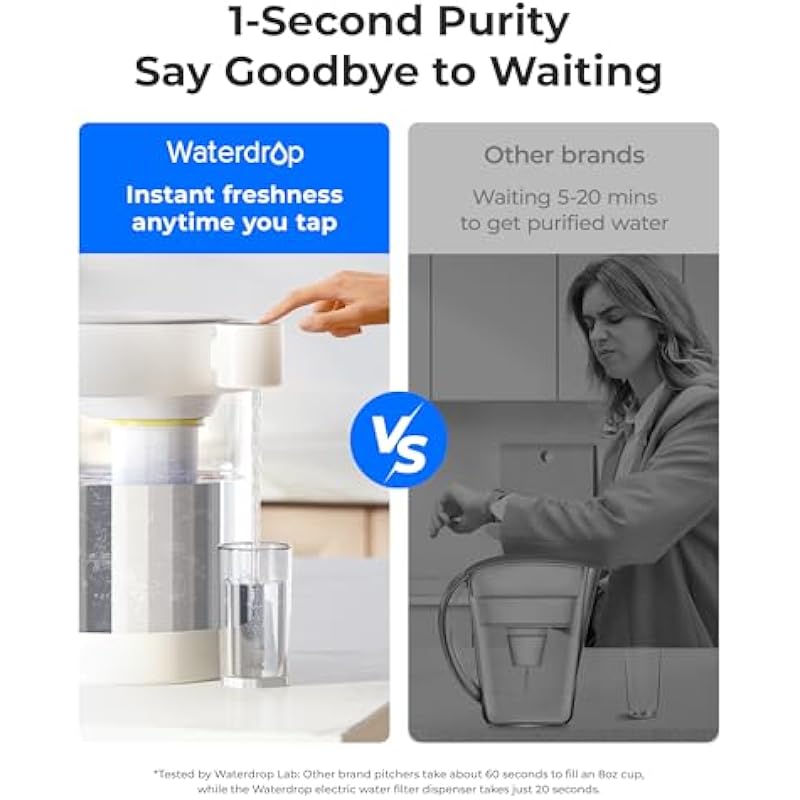 - Get Pure Water in 1 Second: With its electric design and one-key control, this water filter pitcher gives you experience beyond traditional pitchers and dispensers. You no longer have to wait for your water to filter. Simply press a button and get clean water instantly.