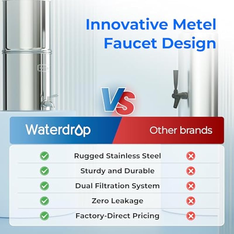 - Large capacity: The Waterdrop King Tank gravity-fed water filter system is a home water filtration system and comes with a 2.25-gallon large capacity, thereby meeting water demands of a family of 4 people for pure water indoors and outdoors.