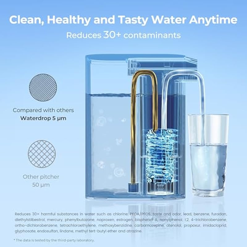 - Mega Electric Pitcher: The filtered water pitcher has been certified by IAPMO against NSF/ANSI 42, 53, 401 & 372 standards to reduce 30+ substances including chlorine, lead, mercury, benzene, bisphenol A and more. It also has been tested by a third-party lab to reduce PFOA, PFOS, ensuring high-quality drinking water.