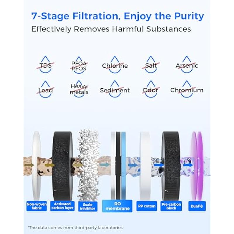 - 𝟕-𝐬𝐭𝐚𝐠𝐞 𝐅𝐢𝐥𝐭𝐫𝐚𝐭𝐢𝐨𝐧 & 𝐋𝐄𝐃 𝐅𝐮𝐧𝐜𝐭𝐢𝐨𝐧: This countertop RO system is passed official third-party laboratory (SGS) test according to NSF/ANSI 58&42 standard, effectively reduces 95.34% TDS, 99.5% Chrome, 97.38% Chromium, 99.53% Fluoride, 91.67% Arsenic, 99.69% Lead and PFAS, PFOA, PFOS, iron, radium, calcium, nitrate, chloride, and radioactive substances. The LED light system also effectively strlzs the double water tanks, always guaranteeing clean and healthy water