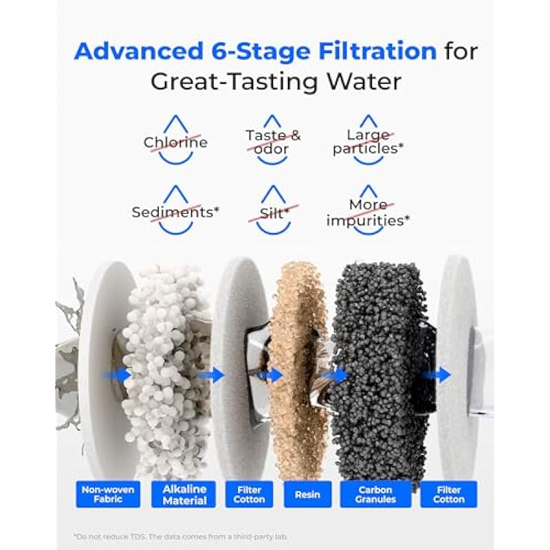- Advanced 6-Stage Filtration: The 6-stage filtration reduces chlorine, odors, sediments, and more, giving you clean, refreshing water. A combination of advanced materials provides crisp, great-tasting water with every sip. Claim of reduction verified by a third party laboratory testing.