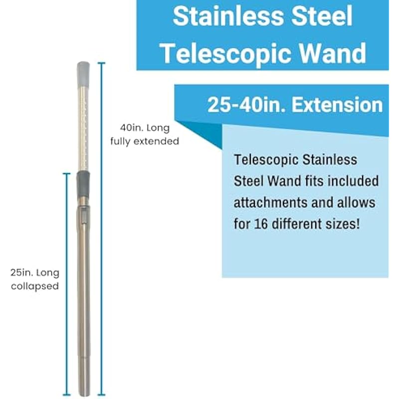 - The stainless steel adjustable vacuum wand attachment allows for 16 adjustable lengths with a collapsed reach of 25in. and a 40in. reach when fully extended.